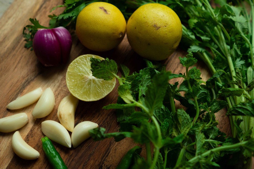 3 cups coriander; 1 cup fresh mint; 1” piece of ginger; 3 green chillies; 1 tbsp minced garlic; 1 chopped onion; 1 tsp fennel seeds; 40 ml lemon juice; 1 tbsp roasted cumin powder; salt to taste