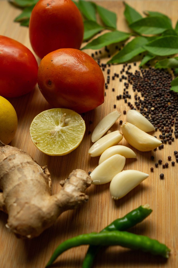 Heat oil in a pan. Add mustard seeds, curry leaves, ginger and garlic. Once cooked, add tomatoes and cook for 5–6 mins. Add the seasoning and cook 3–4 mins or until the tomatoes are squishy. Cool before serving.