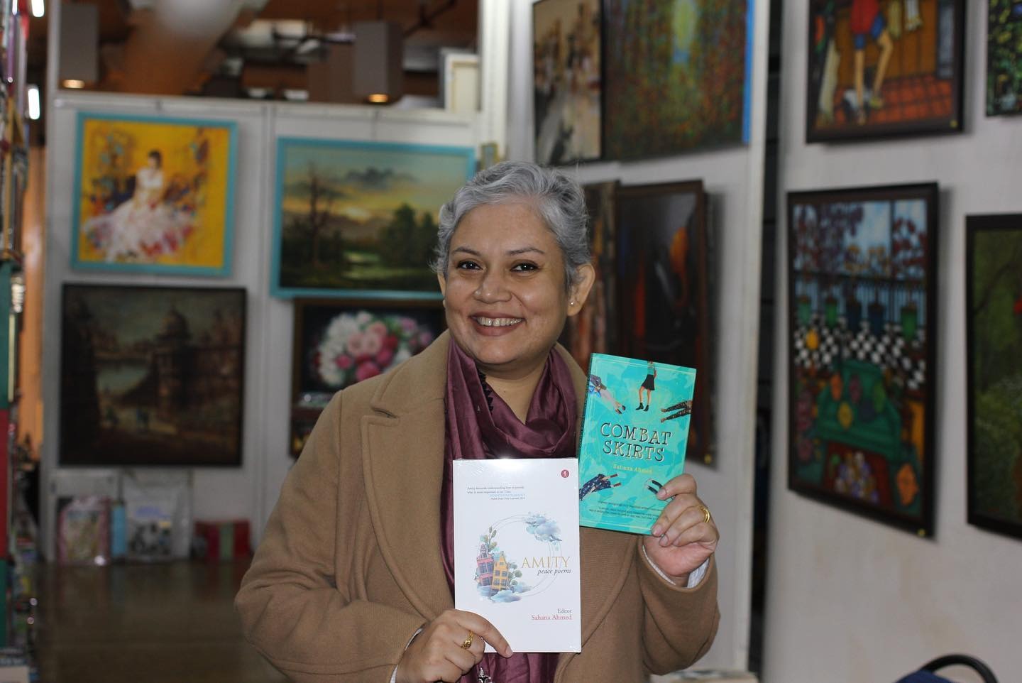 Sahana Ahmed with her books Combat Skirts (2018) and Amity: Peace Poems (2022)